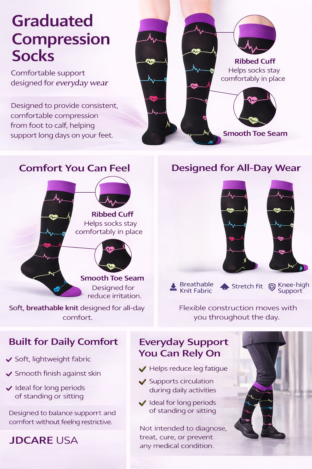 JDCARE USA Compression Socks are designed to support daily comfort and mobility. The knee-high design provides a secure, supportive fit that works well for long shifts, travel days, and recovery-focused routines at home.