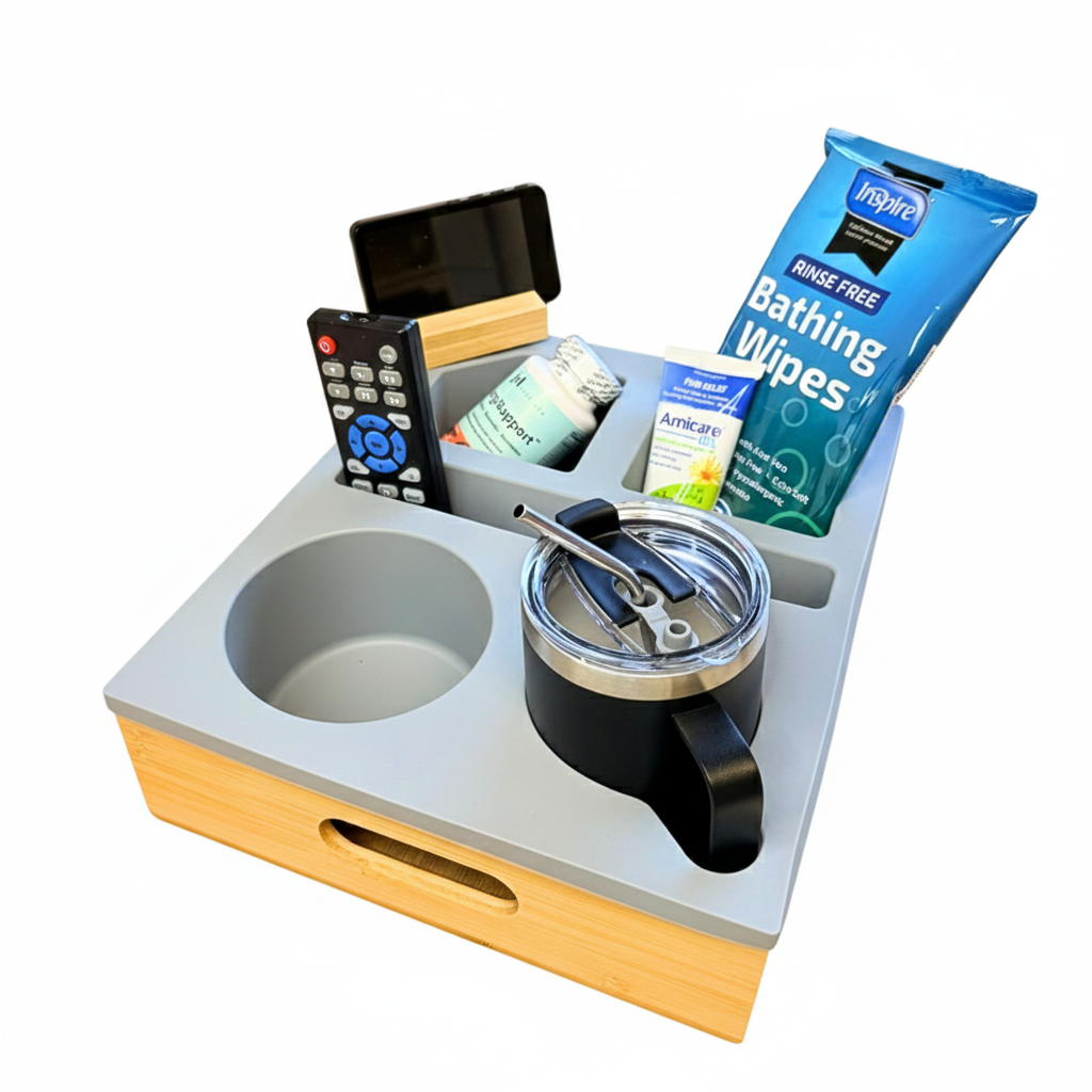 The JDCare Recovery Bed Tray keeps drinks, medications, wipes, snacks and your phone organized in one sturdy bedside tray, so you are not constantly reaching, twisting or getting up.
