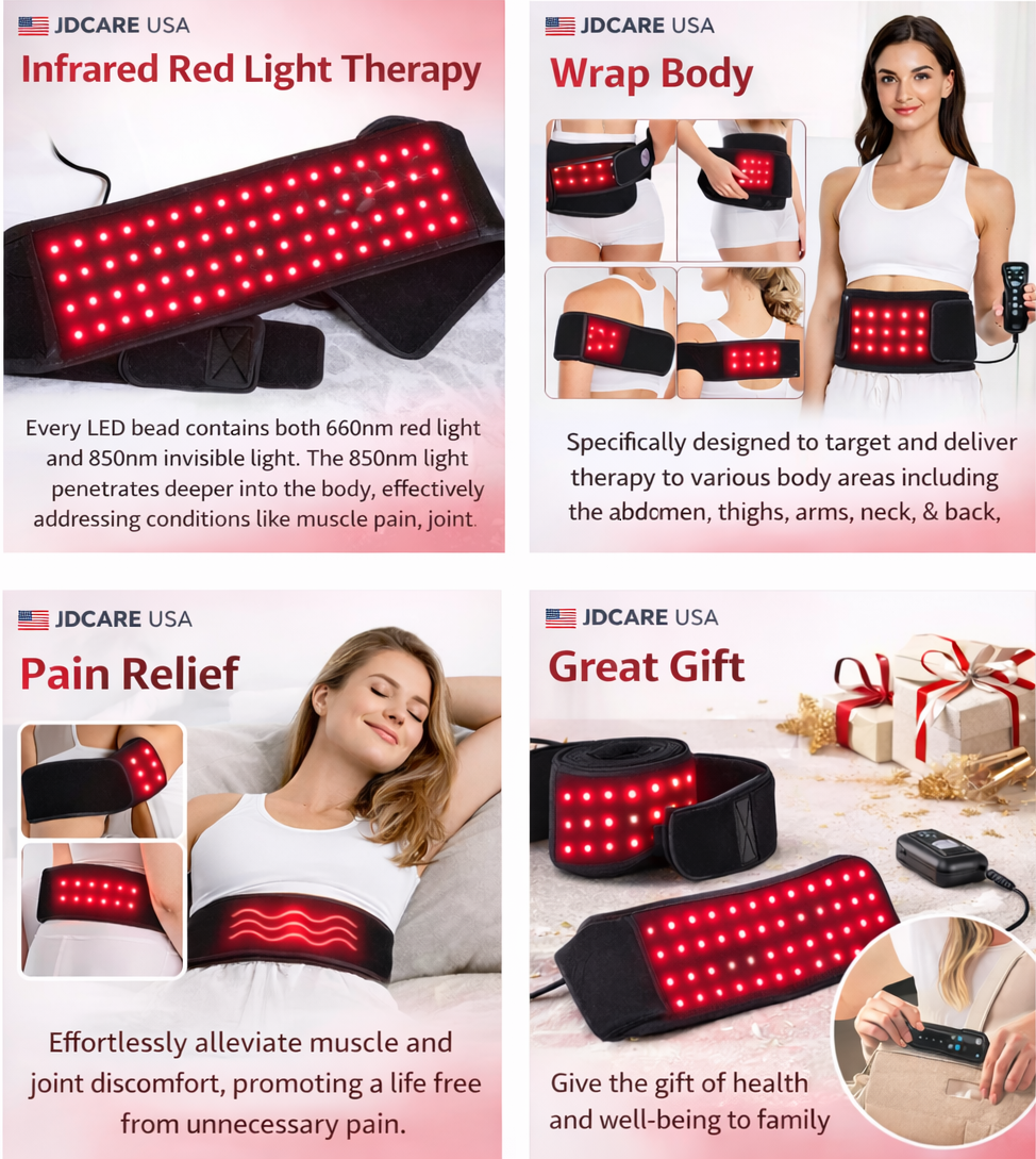 The JDCARE USA Red Light Therapy Wrap delivers targeted light therapy where your body needs it most. Each LED bead emits both 660nm red light and 850nm infrared light, designed to support comfort, relaxation, and recovery-focused routines. The flexible wrap makes it easy to position on multiple areas, so you can focus on the spots that feel sore or tight.