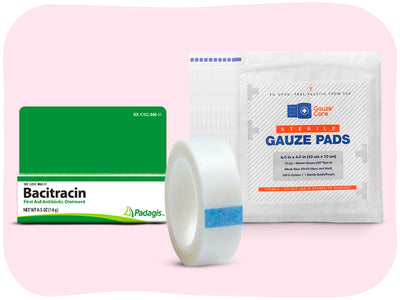 Our post-op kit includes premium gauze pads, bacitracin for infection prevention, and soft medical tape for gentle, secure wound care.