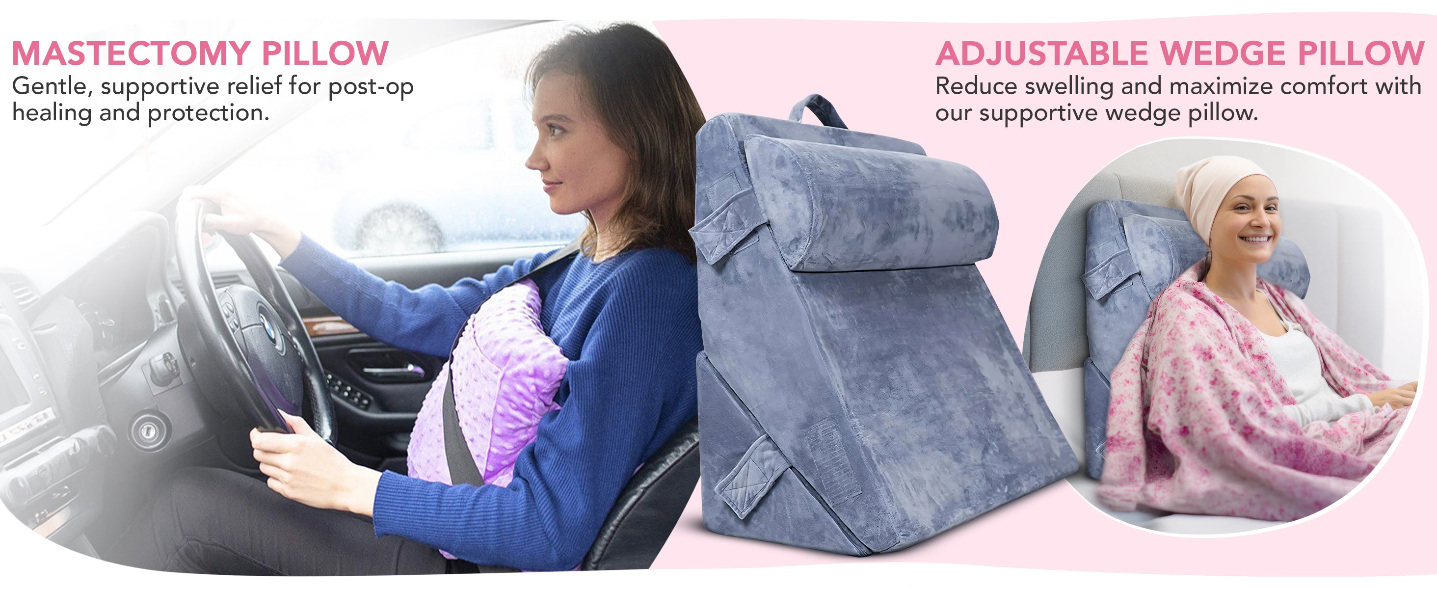 Supportive Pillows include a mastectomy pillow, seatbelt pillow, and wedge pillow to protect incisions, relieve pressure, and keep you comfortably positioned day and night.