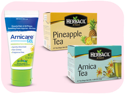 Our recovery kit features arnica gel, arnica tea, and pineapple tea to support natural healing and reduce inflammation.