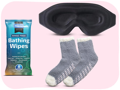 A premium sleep mask, cozy grip socks, and body bathing wipes to keep you comfortable and refreshed during healing.